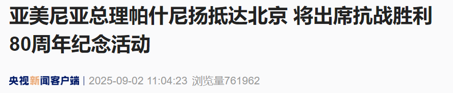 On the morning of September 2, Armenian Prime Minister Nikol Pashinyan arrived in Beijing by high-speed rail to attend the events commemorating the 80th anniversary of the victory in the Chinese People’s War of Resistance Against Japanese Aggression and the World Anti-Fascist War.