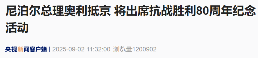This morning (September 2), Nepali Prime Minister KP Sharma Oli arrived in Beijing by high-speed rail to attend the events commemorating the 80th anniversary of the victory in the Chinese People’s War of Resistance Against Japanese Aggression and the World Anti-Fascist War.