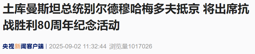 This morning (September 2), Turkmen President Serdar Berdimuhamedov arrived in Beijing by high-speed rail to attend the events commemorating the 80th anniversary of the victory in the Chinese People’s War of Resistance Against Japanese Aggression and the World Anti-Fascist War.
