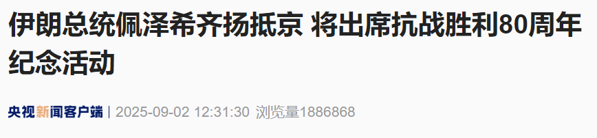 At noon today (September 2), Iranian President Masoud Pezeshkian arrived in Beijing by high-speed rail to attend the events commemorating the 80th anniversary of the victory in the Chinese People’s War of Resistance Against Japanese Aggression and the World Anti-Fascist War.