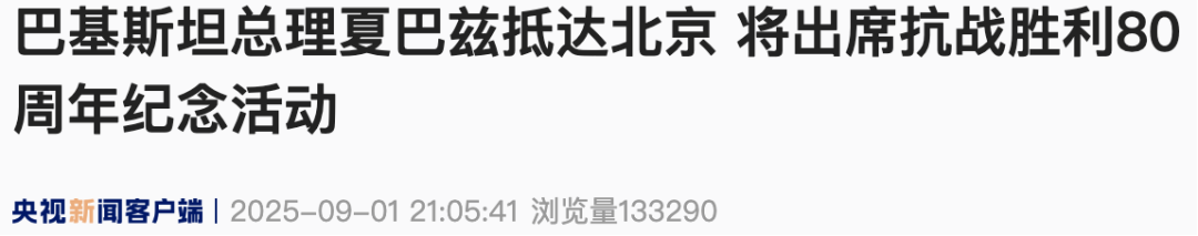 On the evening of September 1, Pakistani Prime Minister Shehbaz Sharif arrived in Beijing by high-speed train to attend the events commemorating the 80th anniversary of the victory in the Chinese People’s War of Resistance Against Japanese Aggression and the World Anti-Fascist War.