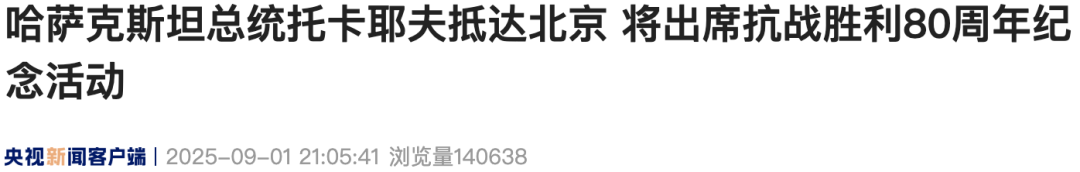 On the evening of September 1, Kazakh President Kassym-Jomart Tokayev arrived in Beijing by high-speed train to attend the events commemorating the 80th anniversary of the victory in the Chinese People’s War of Resistance Against Japanese Aggression and the World Anti-Fascist War.