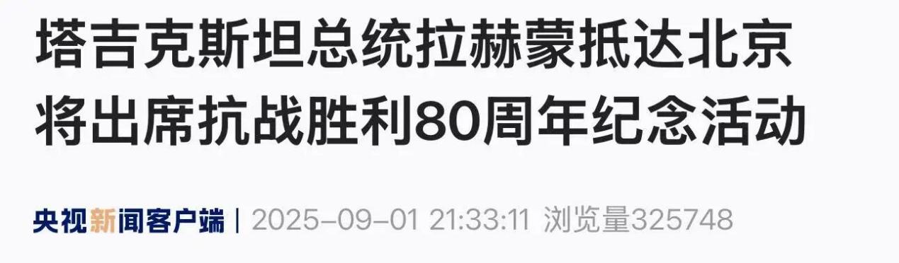 On the evening of September 1, Tajik President Emomali Rahmon arrived in Beijing by high-speed train to attend the events commemorating the 80th anniversary of the victory in the Chinese People’s War of Resistance Against Japanese Aggression and the World Anti-Fascist War.