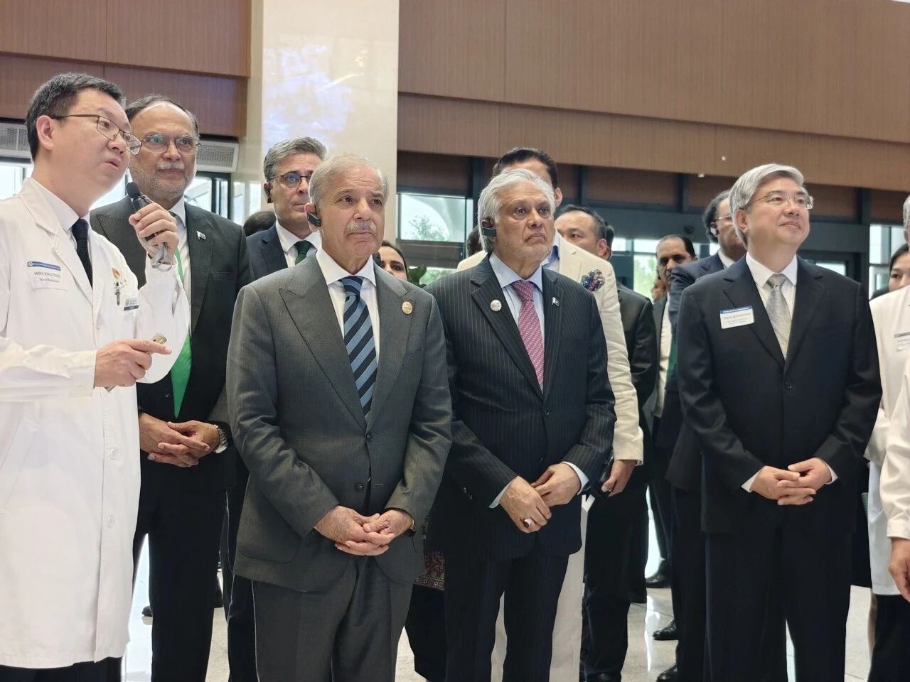 9月2日中午,巴基斯坦总理夏巴兹一行在北京安贞医院通州院区参观。图为夏巴兹(前排左二)在门诊楼听取介绍。 白波摄
