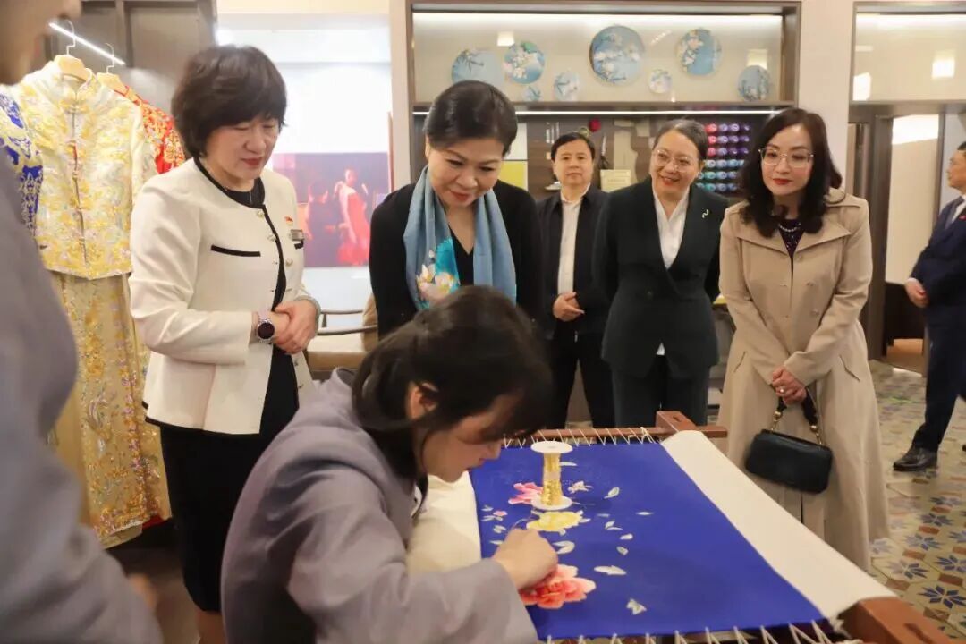 二楼高级定制区,映入眼帘的盘金绣婚服展现了中式服装手工制作非遗技艺的精华,现场更有传统非遗技师展示盘扣制作、京绣工艺等。同时展陈的还有老字号内联升的老北京布鞋,外宾详细了解千层底布鞋制作技艺,根据现代消费者需求开发的新国潮布鞋吸引了最多关注。在参观京派旗袍、中山装、新中式国潮服饰时,外宾对瑞蚨祥中式服装设计与越南传统服饰奥黛元素的融合表现出浓厚兴趣,称赞这是一场东方美学的跨时空对话。