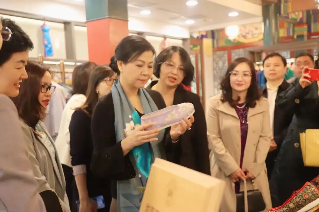 越共中央总书记、国家主席苏林偕夫人吴芳璃于4月14日至17日对中国进行国事访问。14日下午,吴芳璃夫人一行到访北京市西城区大栅栏商业街,在老字号瑞蚨祥体验中国传统服饰文化魅力。中联部副部长孙海燕、西城区人民政府副区长杜洪悦陪同参访。