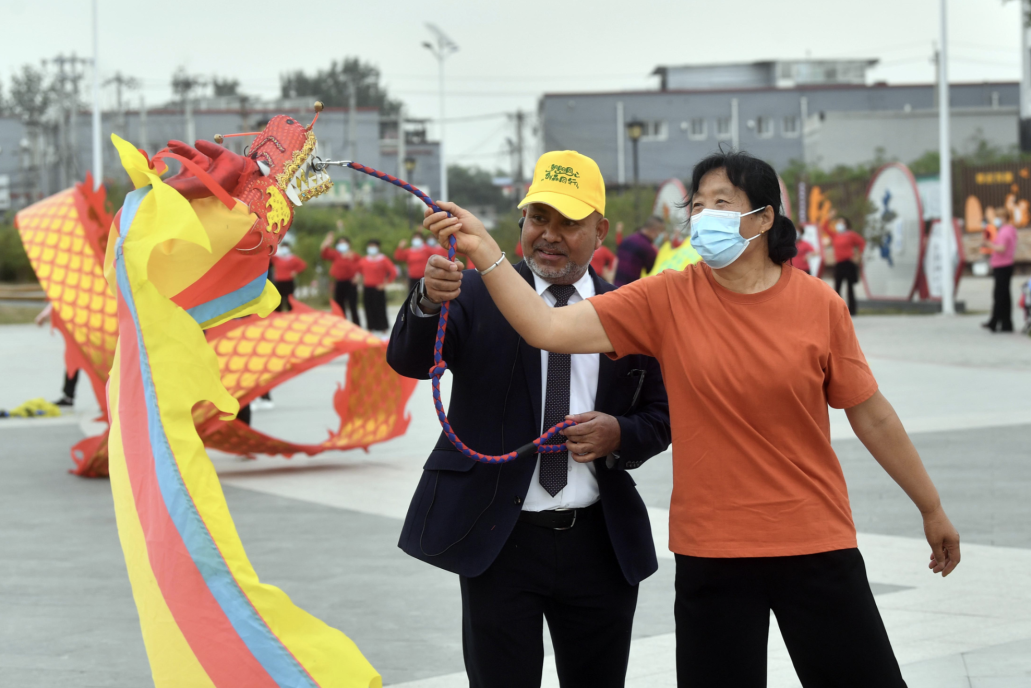 在朝阳区金盏东村,使节们参观文化活动中心和村史馆,并饶有兴趣地参与到村民的文化活动中。